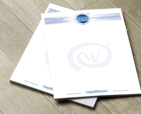 Papier preprint 90 g, kolorowe jednostronne 4/0, format A4. Druk offsetowy – termin realizacji do 5 dni roboczych. Papiery firmowe wysokonakładowe podlegają wycenie indywidualnej. Zapytanie cenowe należy wysłać drogą mailową uwzględniając preferowany nakład do druku.
